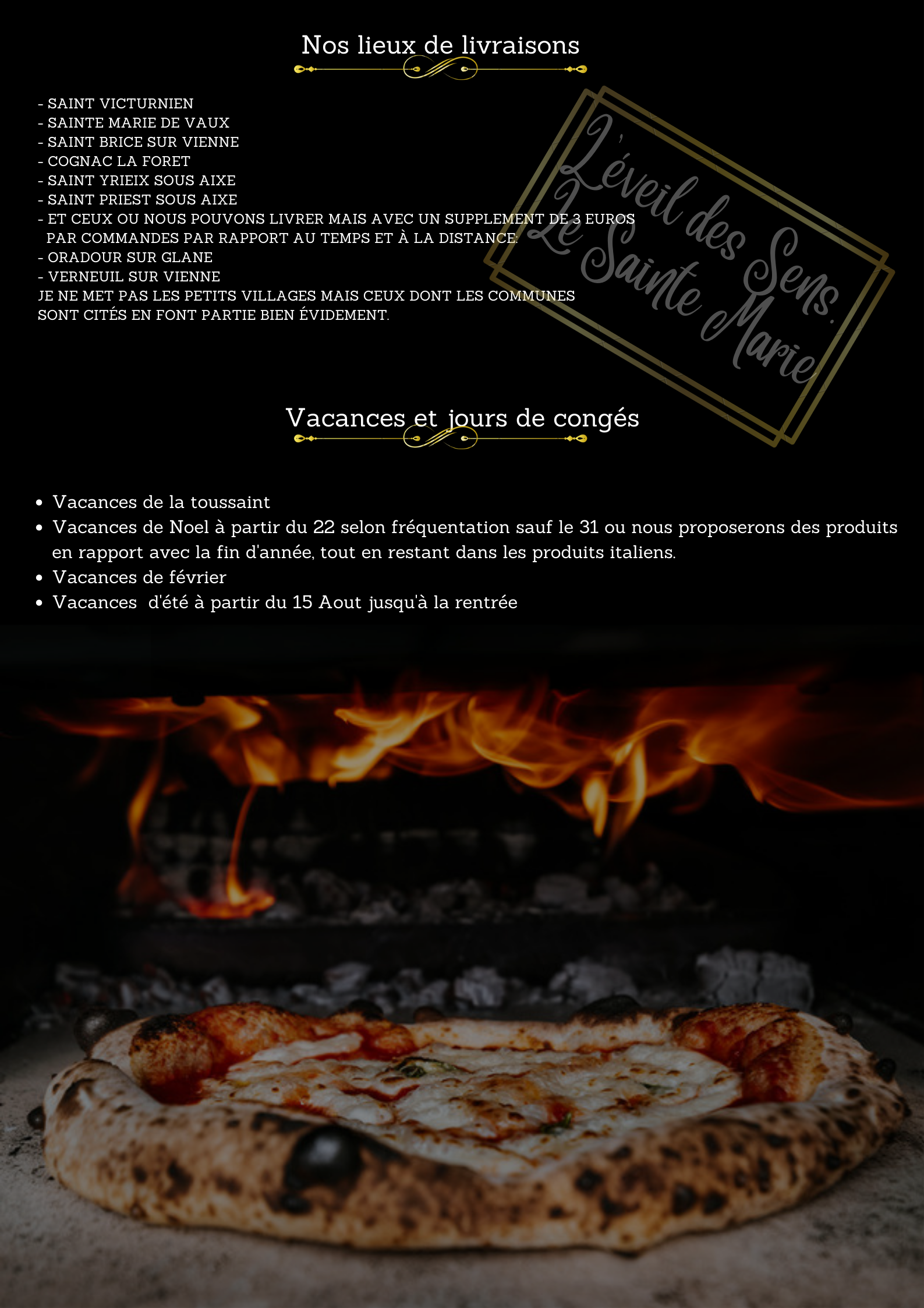Voici toutes les informations sur le Livraison de pizzas L'éveil des sens. Le sainte marie qui ce trouve au 5 Rue du Petit Bois, 87420 Sainte-Marie-de-Vaux (87). Sur cette fiche vous trouverez les photos, l'adresse, les horaires d'ouverture, le numero de téléphone et les avis clients.Vous pouvez églement rédiger un avis si vous le souhaitez en bas de page.