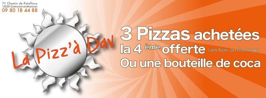 samedi dernier j'ai acheté deux pizzas au restaurant de la barque à Marignane , elles ont fini à la poubelle , atroce , degueulasse aujourd'hui j'ai commandé deux pizzas DAV , elles sont excellentes , on s'est régalé , le livreur à l'heure , le patron au moment de la commande super sympa , franchement il ne faut pas hésiter , merci à vous !!!!!