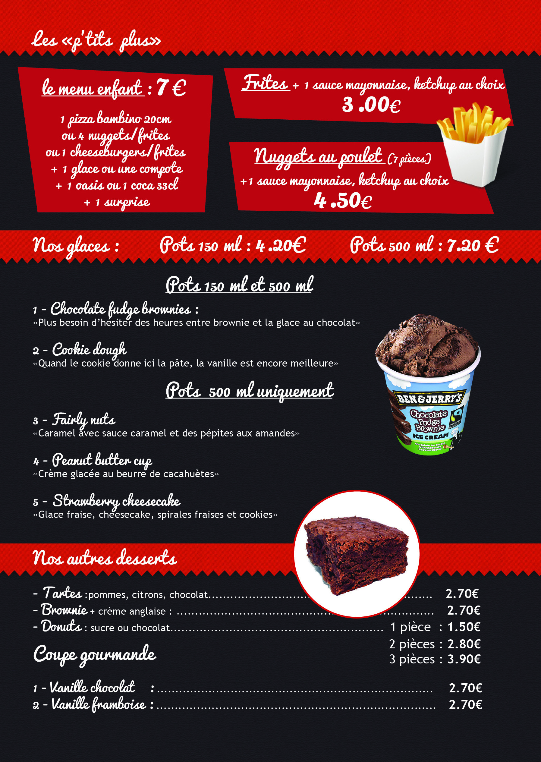 Les pizzas sont très bonnes et le choix varié, en plus des autresp pâtes, gratins, burgers et paninis qu'ils proposent. Les pizzas sont personnalisables et sont toutes disponibles en 3 tailles. Les prix sont corrects (de 4,80€ à 19,50€) et l'équipe agréable.