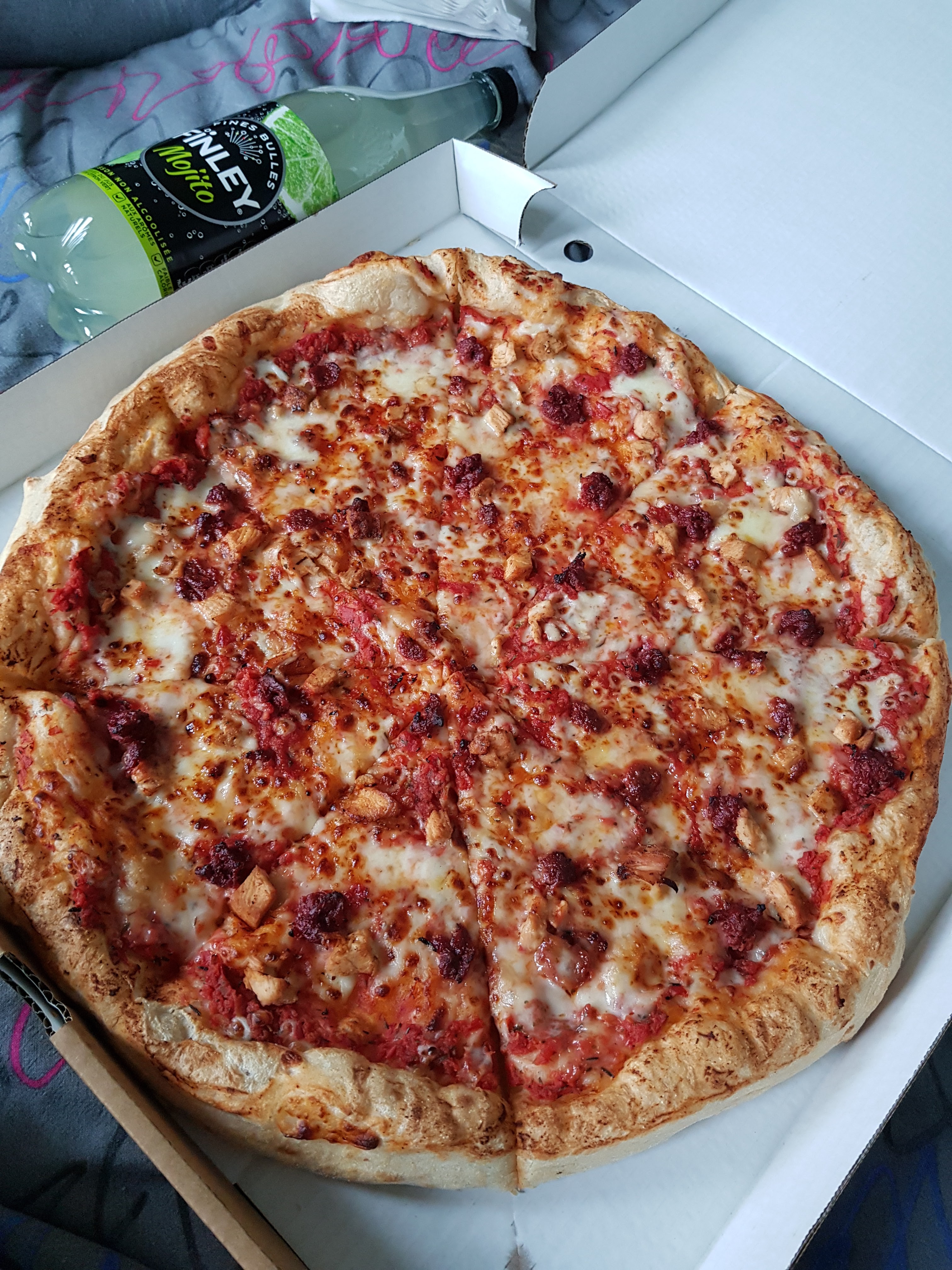 On a commandé en livraison 3 pizzas le vendredi 27 décembre soir, il y a eu 20 minutes de retard, mais en soit ce n’est pas un problème. Les pizzas étaient bonnes, malheureusement on a été 2 personnes sur 3 à avoir été malades le lendemain (les 2 plus fragiles du groupe niveau intestin). Les pizzas qu’on a mangé contenaient du jambon, bacon, poulet et des merguez.