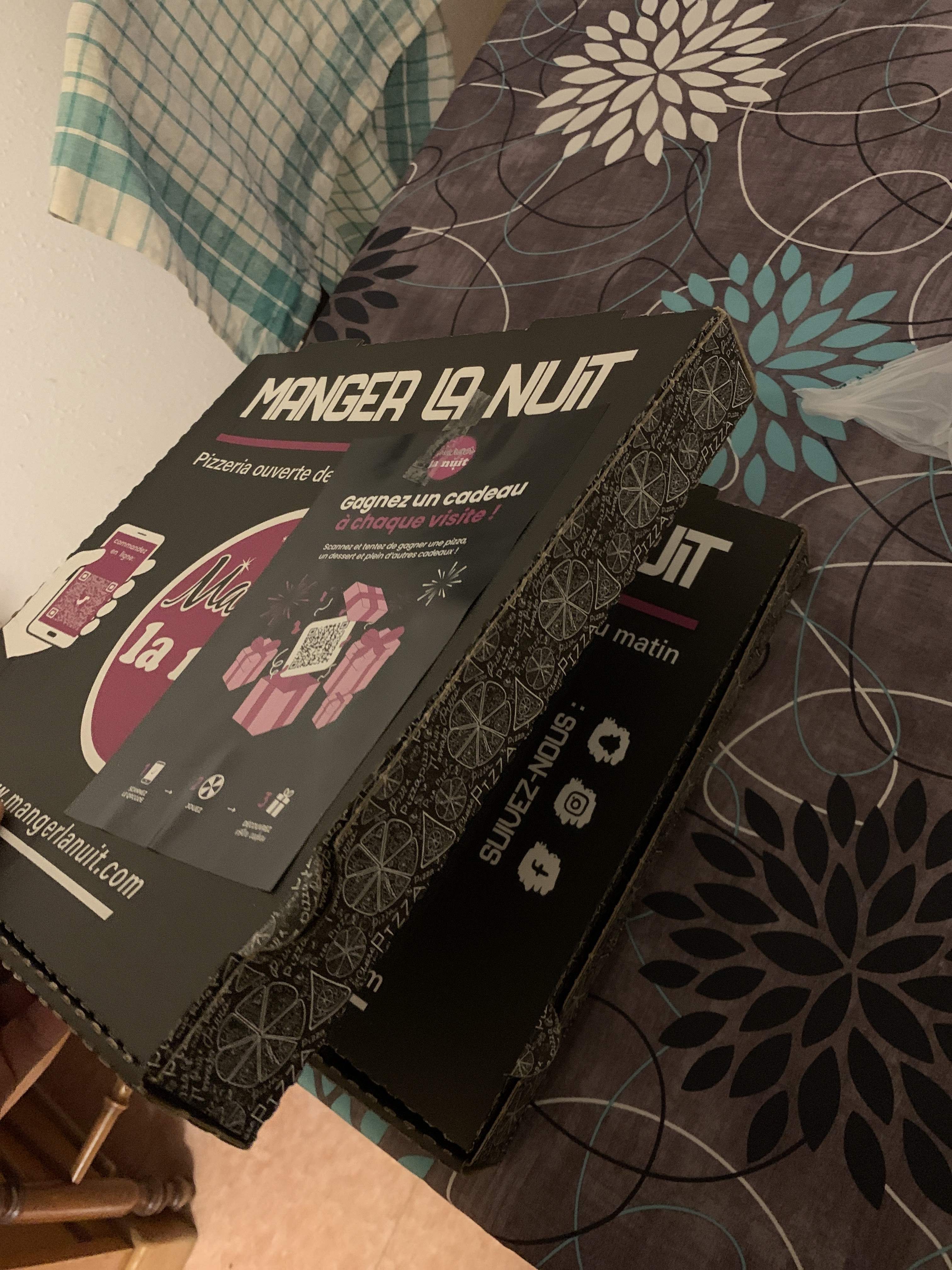 Je suis habitué de puis très longtemps à commander mes pizzas chez manger la nuit étant donné que c’est la seule pizzeria à servir aussi tard... SAUF QUE les 3 dernières fois où j’ai pris ma favorite bolo grosse intoxication alimentaire mal de ventre infernal, vomissement, et mal de tête sur plusieurs jours, bref ça en a malheureusement perdu en qualité ...