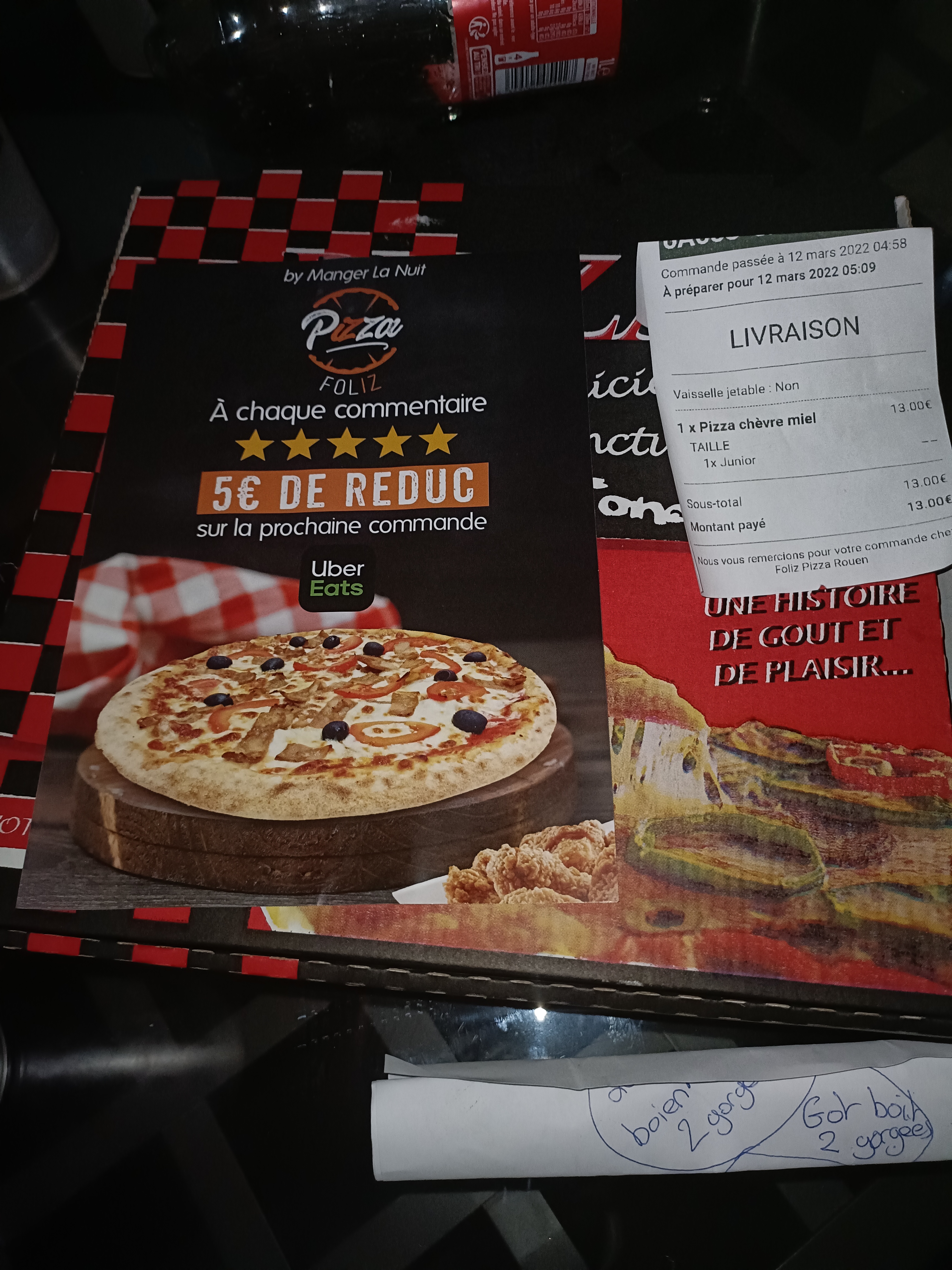 Service impeccable je commande depuis six ans chez eux , ils vous appellent avant d'arriver et vous disent de rester à l'abri quand il pleut par exemple, pizza généreuse de 18h à 6h du matin , bien fournie, rapport qualité prix au top ! Merci d'être sur Rouen !! Je recommande vivement