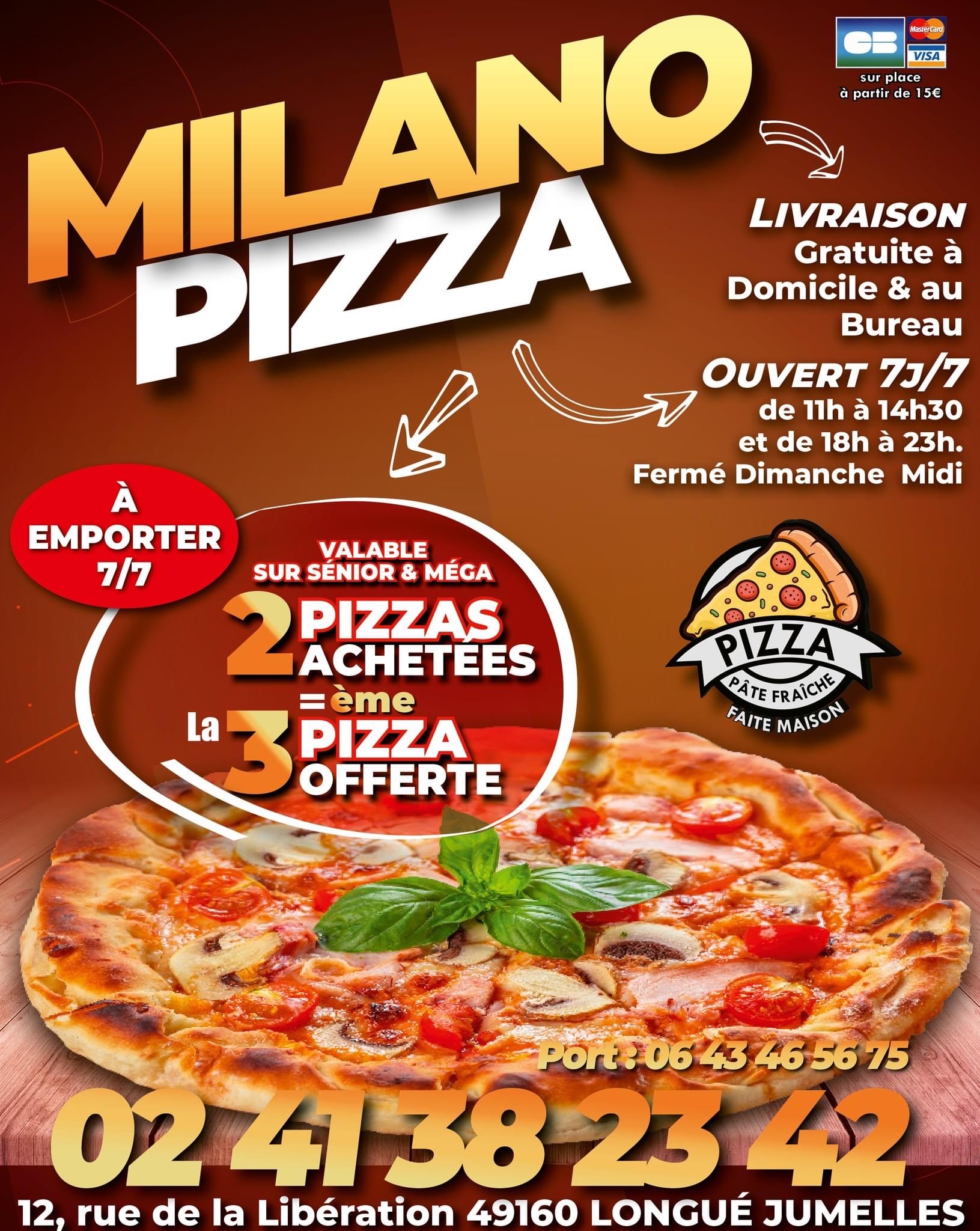 Voici toutes les informations sur le Livraison de pizzas milano pizza longué qui ce trouve au 12 Rue de la Libération, 49160 Longué-Jumelles (49). Sur cette fiche vous trouverez les photos, l'adresse, les horaires d'ouverture, le numero de téléphone et les avis clients.Vous pouvez églement rédiger un avis si vous le souhaitez en bas de page.