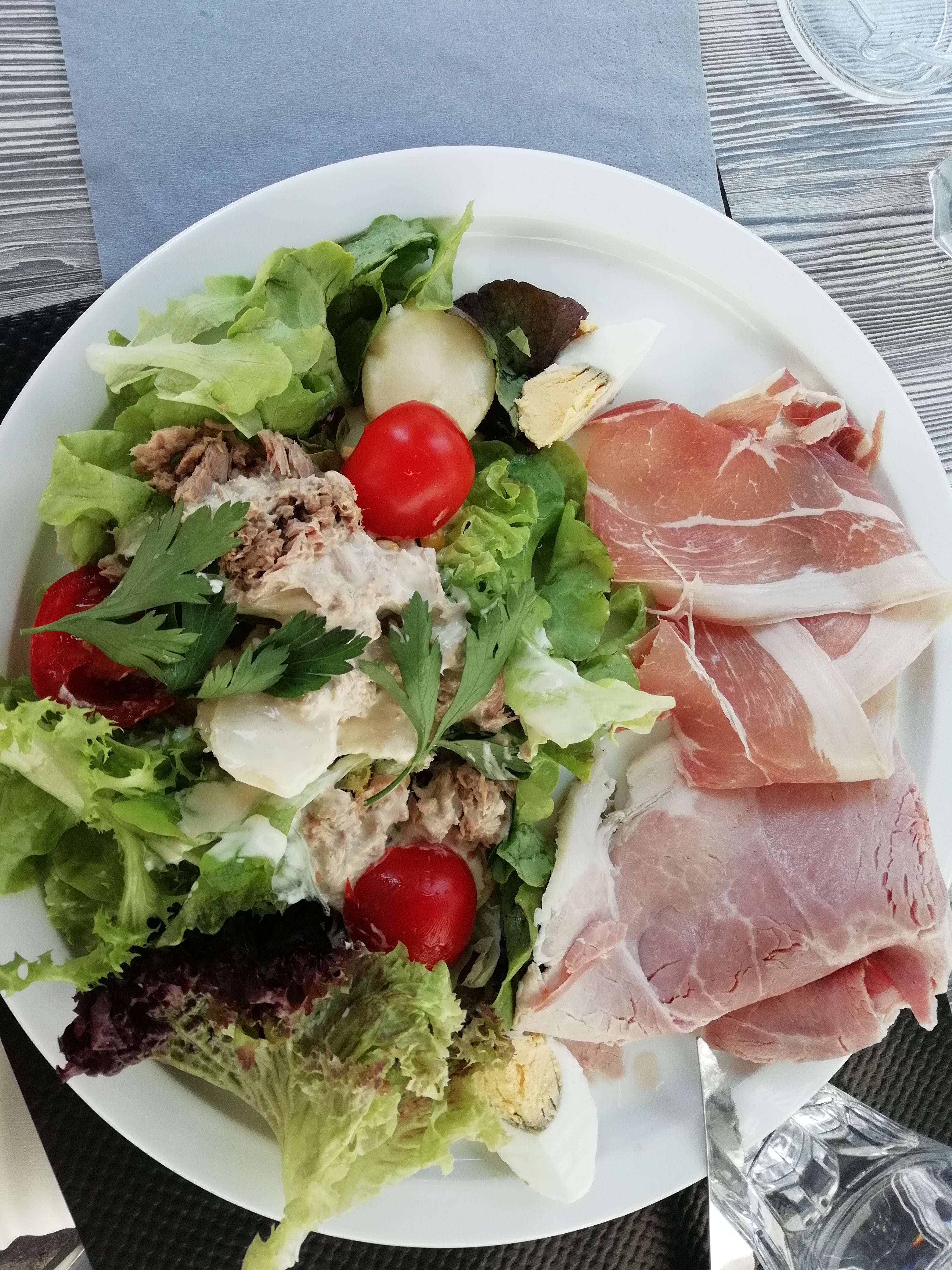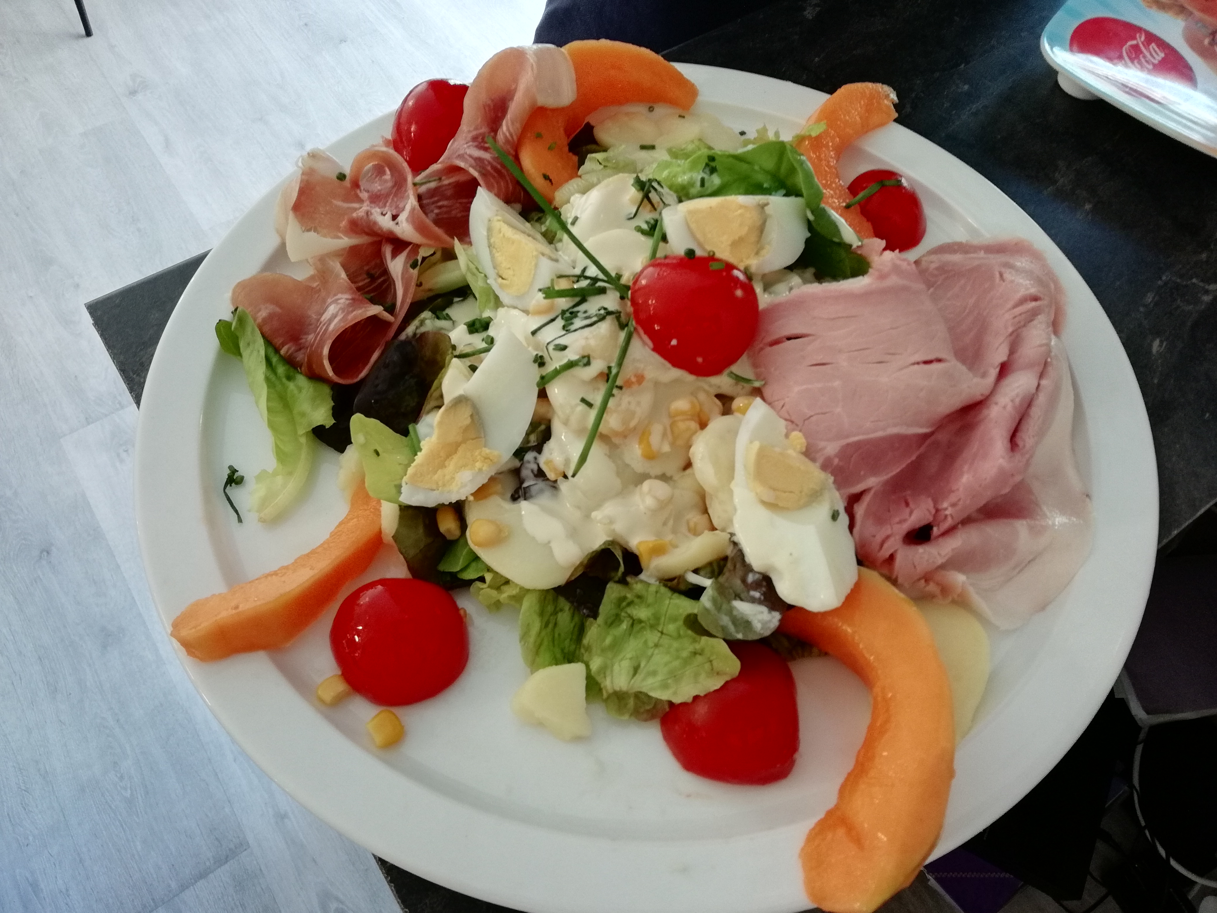 Salade repas en terrasse, un bon moment au soleil! Assiette très peu salée ce qui est pour moi un très bon point !