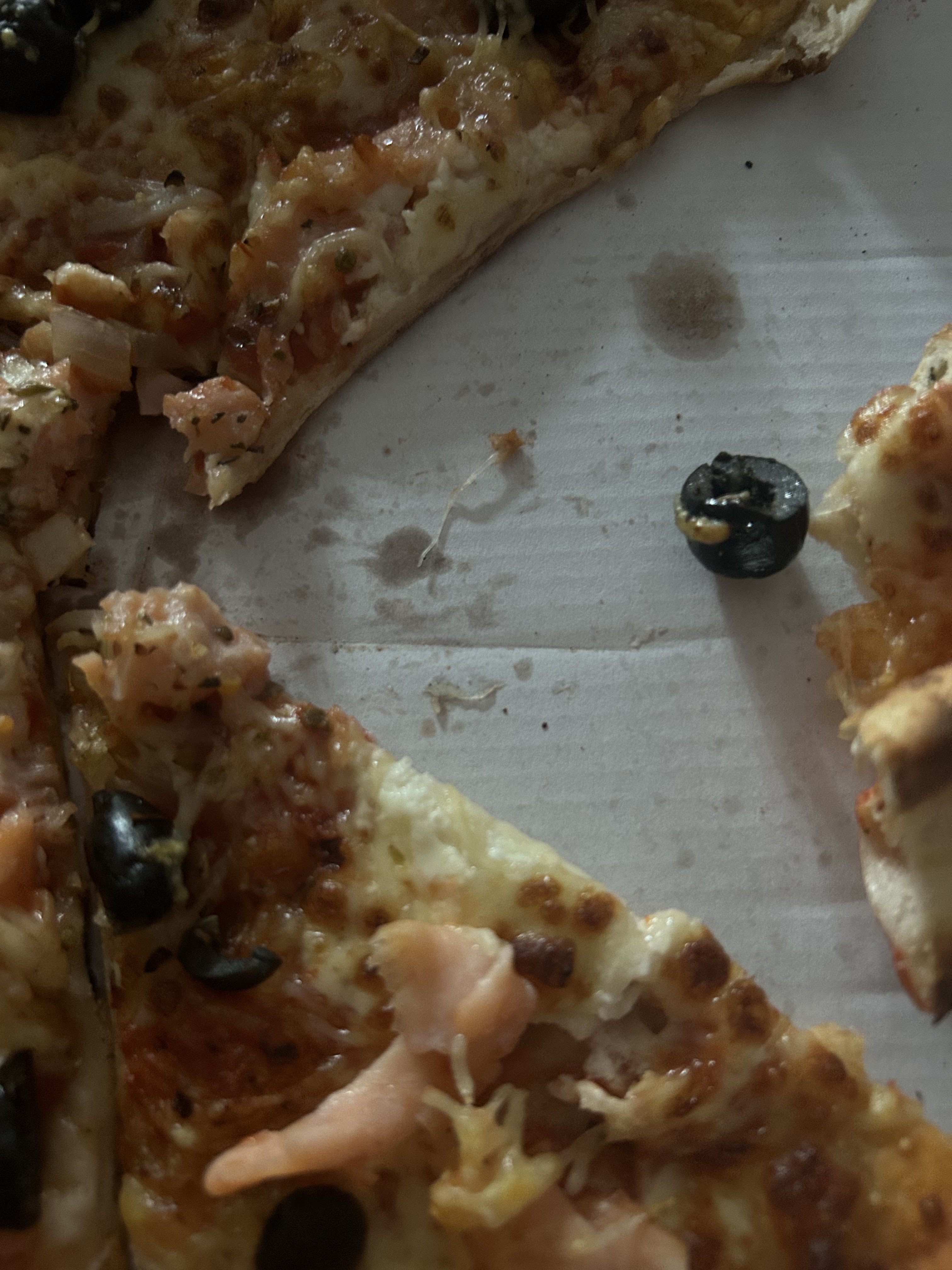 Idem, la pizza c'est mort, Les champignons laisse tomber, la pâte cramée, le cochon du caca...