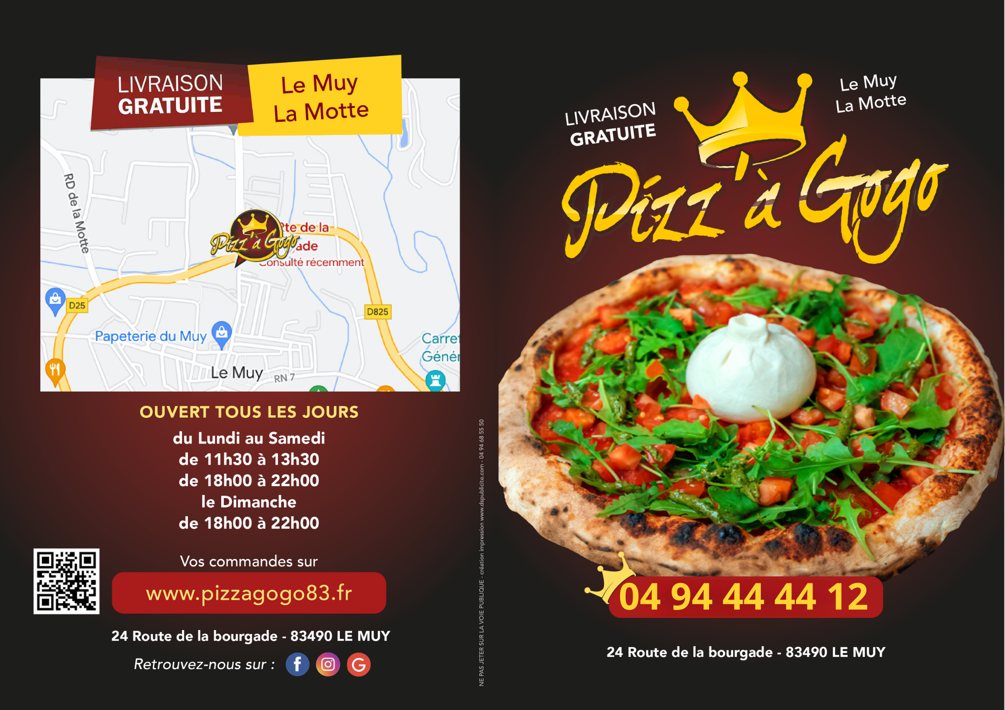 Voici toutes les informations sur le Livraison de pizzas Pizz'a gogo Le Muy qui ce trouve au 24 Rte de la Bourgade, 83490 Le Muy (83). Sur cette fiche vous trouverez les photos, l'adresse, les horaires d'ouverture, le numero de téléphone et les avis clients.Vous pouvez églement rédiger un avis si vous le souhaitez en bas de page.