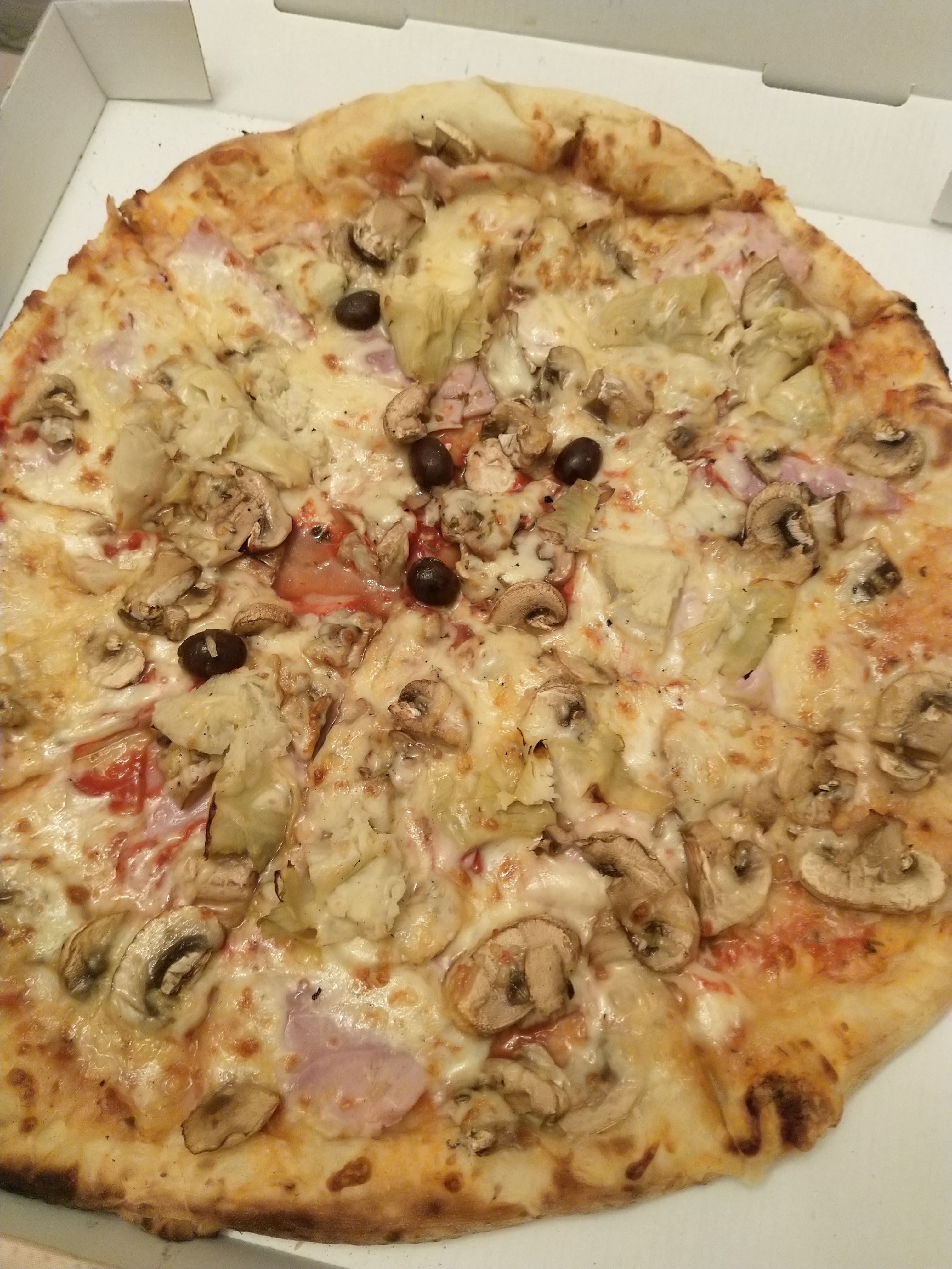 Pizza dur comme fer, aussi cuite que moi hier en fin de soirée, j’ai pris rdv chez mon dentiste à la fin du repas.