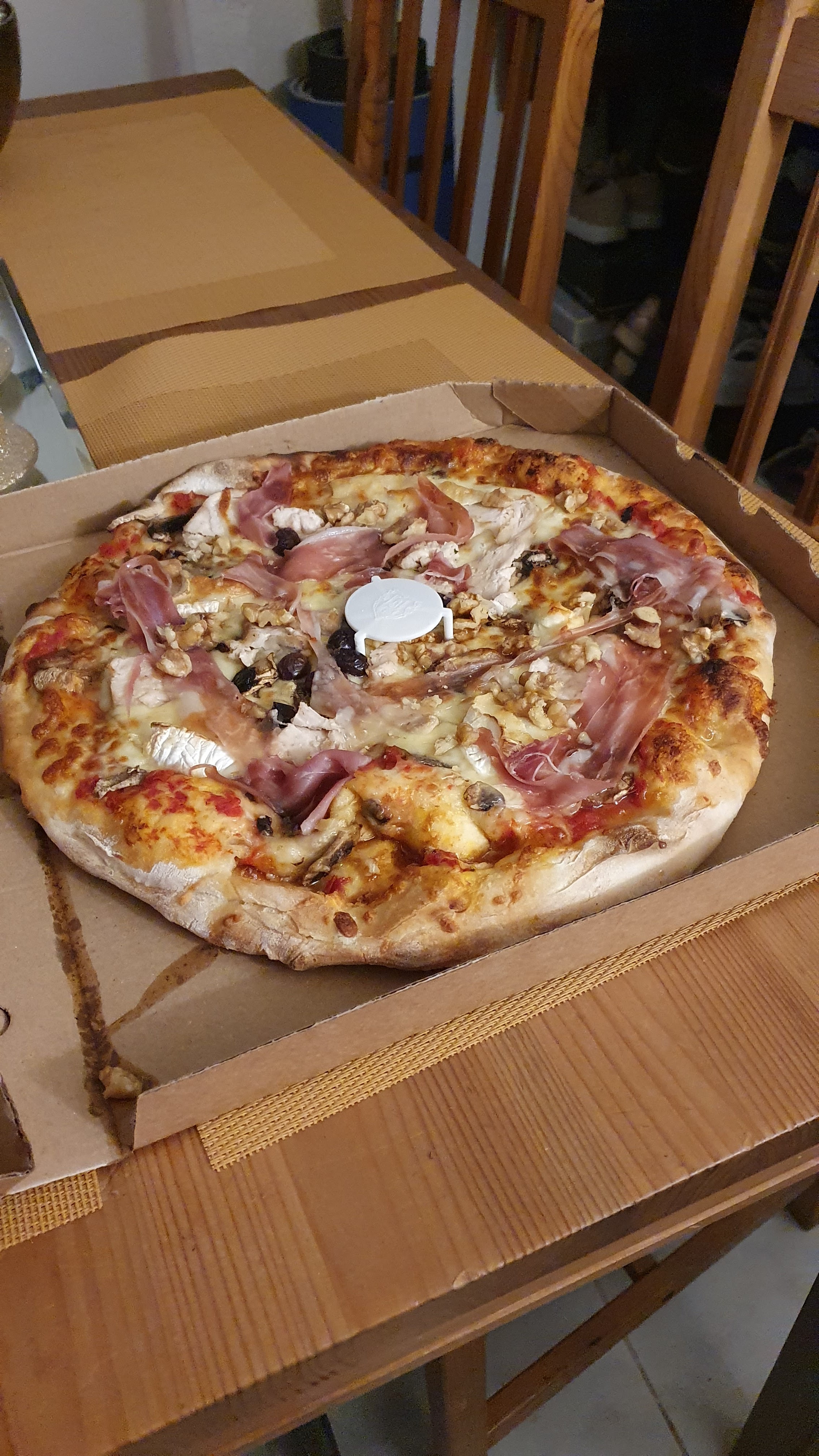 Super pizza très bonne avec super tabouret! Merci à Santo pour la livraison :) Coupée, bien cuite et exquise