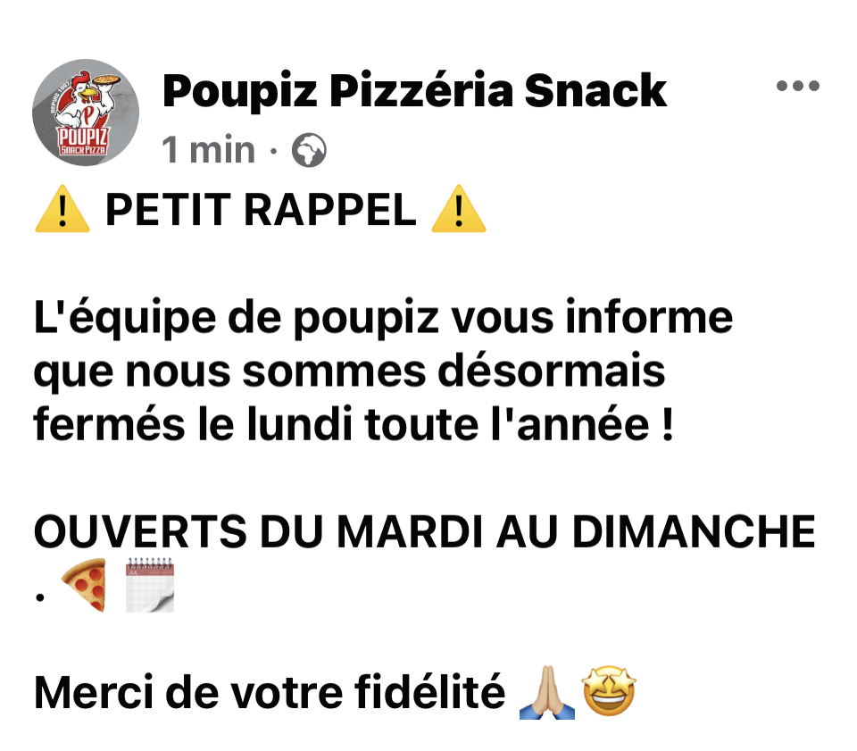 Étant un client fidèle de Poupiz depuis plusieurs années, je pense que ça y est, ils ont vendu car les prix vont augmenter ( Nouveau flyers ) le pain a changé (pour les kebab) et moins de viande, enfin, ce n’est que mon avis. le visuel des pizzas aussi ont changé.. Si jamais c’est le cas je ne ferai plus partie du fichier client de Poupiz malgré de nombreuses années de fidélité.