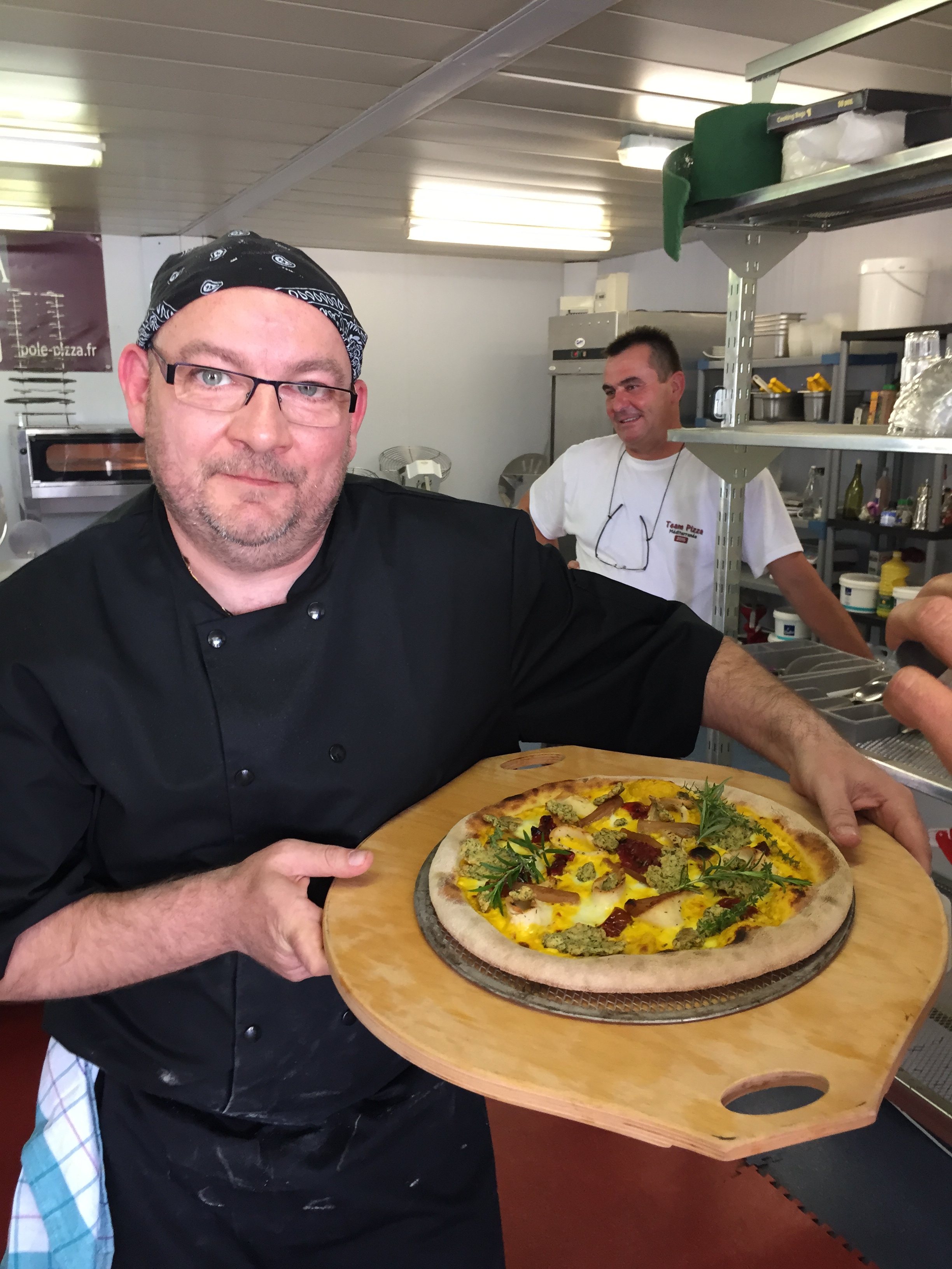 Ne vous fiez pas à l'allure speed de Karine, elle note tout à 100km/h sous d'oeil placide de Bruno... Une équipe chaleureuse qui fait vivre un quartier... Mais Bruno serait un fin cuistot...me suis laissé dire qu'il fait un foie gras à se mettre à genoux. J'ai goûté ....on oublie tout le reste face aux délices... Pizza geniales qui valsent du bât flanc au four à bois et livrées rapide...vous savez la Smart .....