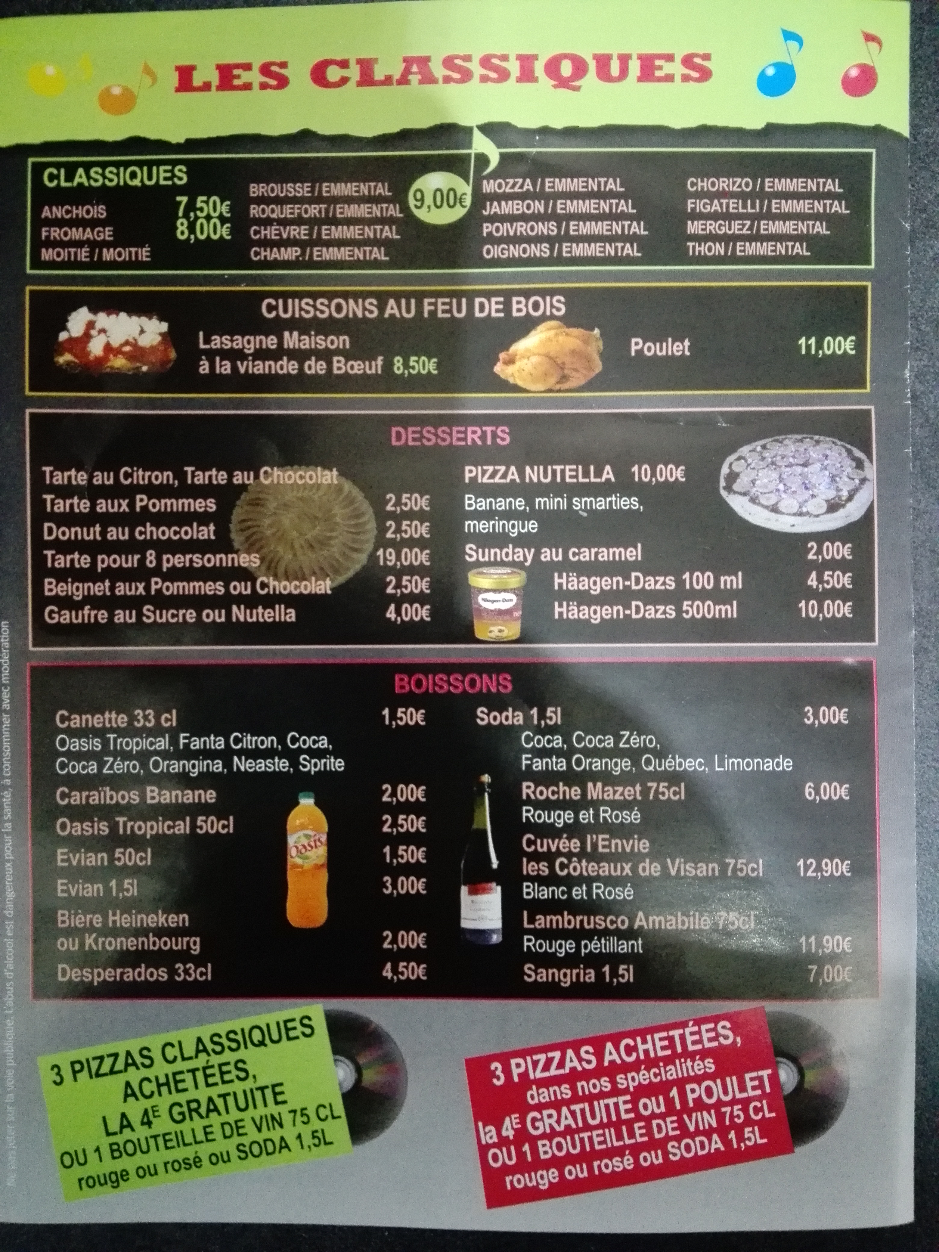 Bonjour Je fais part de mon expérience sur cette pizzeria, très déçu sur la quantité des ingrédients Pizz orientale : 9 voir 10 petits morceaux de merguez rien à voir avec la photo site c’est dommage Pour la qualité de la pizz sur la pâte rien à dire, J’ai quand même mis 3 étoiles ⭐️ par respect Le point positif: je n’ai pas mangé ma pizz car une pizz oignon poivron non merci Tant pis